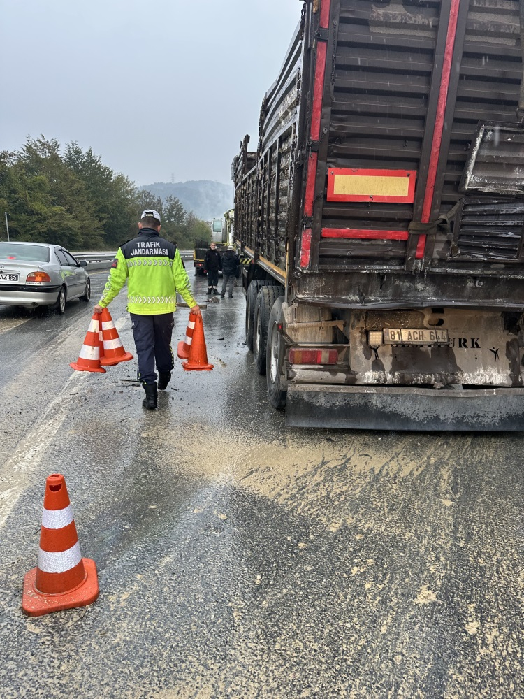 D-655 Düzce-Zonguldak yolunda tır sürücüsü direksiyon hakimiyetini kaybederek bariyerlere çarptı. Yaralanan sürücü hastaneye kaldırıldı. Kaza sonrası trafik tek şeritten sağlanırken, jandarma inceleme başlattı.