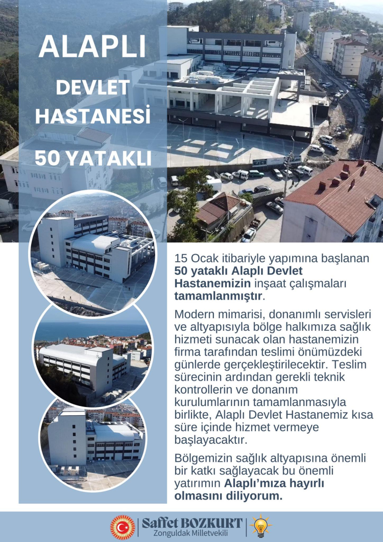 Hastanenin inşaat çalışmaları tamamlandığını açıklayan AK Parti Zonguldak Milletvekili Saffet Bozkurt, "15 Ocak itibariyle yapımına başlanan 50 yataklı Alaplı Devlet Hastanemizin inşaat çalışmaları tamamlanmıştır.