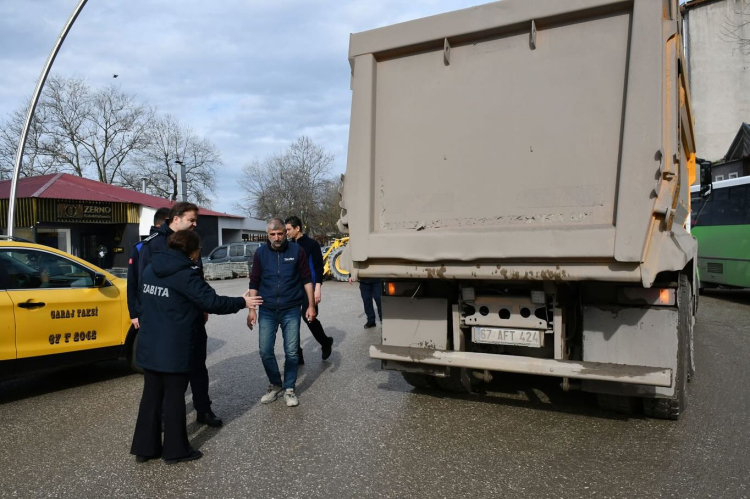 Alaplı Belediyesi Zabıtası, Aşağıdağ Köyü güzergahında Karadeniz Ereğli Askeri Limanı’na hafriyat taşıyan çamurlu kamyonları uyardı. Zabıta Müdürü Şeyda Daşgın, kamyonların yıkanması gerektiğini, aksi halde cezai işlem uygulanacağını belirtti.