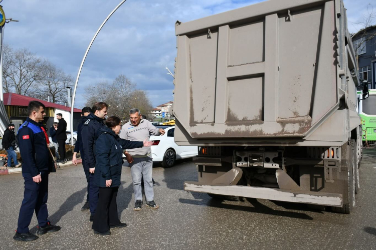 Alaplı Belediyesi Zabıta Müdürü Şeyda Daşgın ile zabıta ekipleri, Aşağıdağ Köyü güzergahında seyir halinde olan çamurlu hafriyat kamyonlarını ilçe merkezinde durdurarak denetim gerçekleştirdi. Yapılan kontrollerde, kamyonların çamurla kaplı şekilde şehir içine girdikleri ve yol ile çevreyi kirlettikleri tespit edildi.