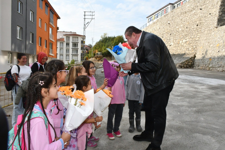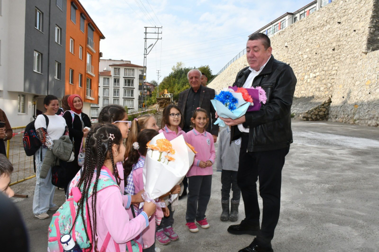 Alaplı Merkez Mahallesi Ihlamur Sokak’ta yeni eğitim öğretim döneminde kapılarını açan Ahmet Zeki Atalay İlkokulu öğrencileri, okul yolu ve mahalle yollarını betonlayarak güvenli hale getiren Alaplı Belediye Başkanı Nuri Tekin’e teşekkür ederek çiçek takdim etti.
