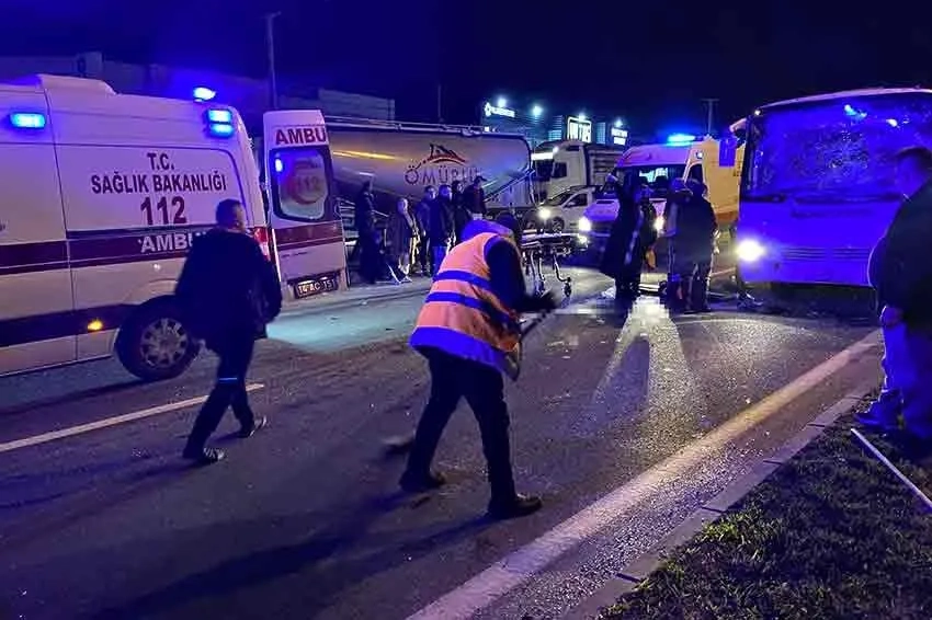 Çarpmanın etkisiyle refüje çıkan 14 S 0224 plakalı midibüs, yan şeritte ilerleyen Aydın S. yönetimindeki 14 S 0238 plakalı otobüse çarptı. Kazada araçlarda bulunan 11 kişi yaralandı. İhbar üzerine olay yerine sağlık, polis ve karayolları ekipleri sevk edildi. Ambulanslarla hastanelere kaldırılan yaralıların hayati tehlikelerinin bulunmadığı öğrenildi. Kaza nedeniyle bir süre kontrollü sağlanan trafik, araçların kaldırılmasının ardından normale döndü. Polis ekipleri kazayla ilgili inceleme başlattı.