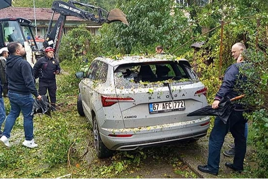 Zonguldak’ın Çaycuma ilçesinde park halindeki bir otomobilin üzerine ağaç devrildi. Olay, Çay Mahallesi Hızır Sokak mevkisinde meydana geldi. Etkisini gösteren fırtına ve dolu yağışı Çaycuma’da hayatı olumsuz etkiledi. Fırtına nedeniyle park halinde bulunan 67 AFC 772 plakalı otomobilin üzerine ağaç devrildi. Olay yerine sevk edilen Çaycuma Belediyesi İtfaiye Müdürlüğü ile Park ve Bahçeler Müdürlüğü’ne bağlı ekipler otomobilin üzerine devrilen ağacı keserek kaldırdı. Araçta büyük çapta maddi hasar oluştu.