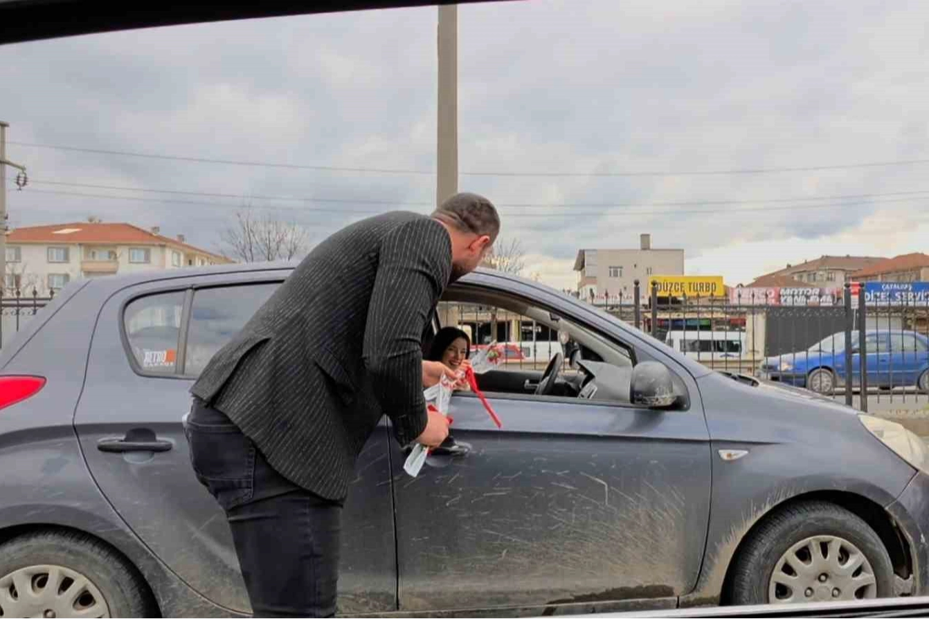 Düzce’de sosyal medya içerik üreticisi, 8 Mart Dünya Kadınlar Günü dolayısıyla 90 yaşındaki babaannesiyle birlikte kadına yönelik şiddete dikkati çekmek amacıyla trafikte farkındalık etkinliği gerçekleştirdi.