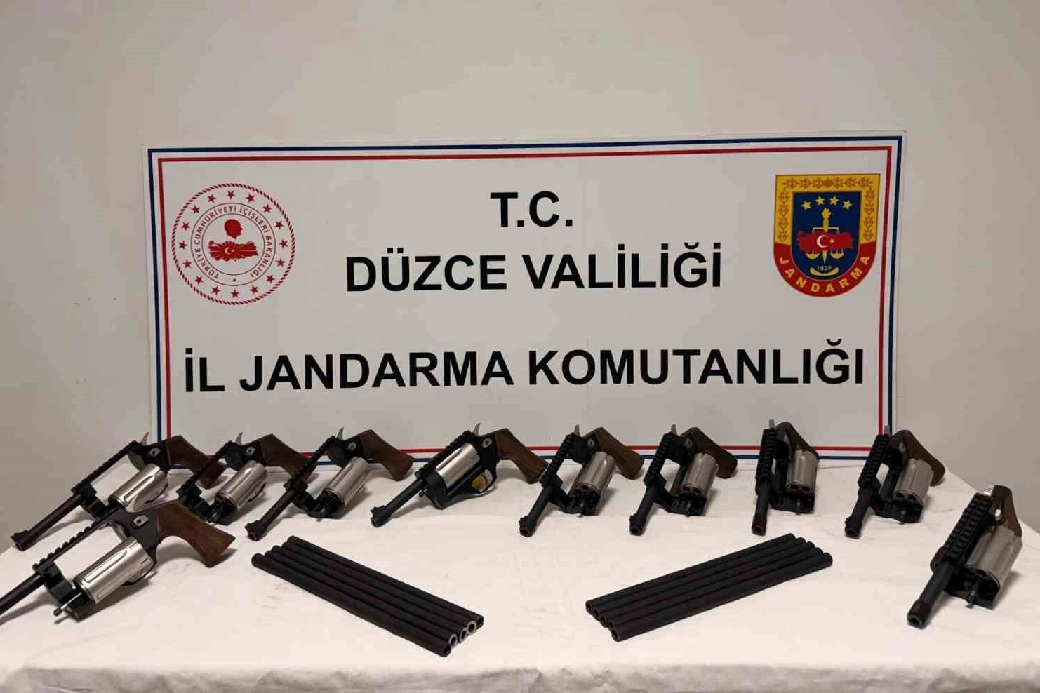 Düzce Cumhuriyet Başsavcılığı koordinesinde yürütülen çalışmalarda, Düzce İl Jandarma Komutanlığı ekiplerince yapılan istihbarı çalışmalar sonucunda Afyonkarahisar’dan, Düzce’ye ruhsatsız silah getirilip satılacağı duyumu alındı. Gümüşova ilçesi Yongalık köyünde ikamet eden A.Ç. isimli şahsın ev eklentilerinde yapılan aramada 10 adet ruhsatsız tabanca ile 10 adet kesik namlu ele geçirildi. Silah mühimmat kaçakçılığı suçunu işleyen A.Ç. ve M.Y. gözaltına alındı. Olayla ilgili olarak soruşturma başlatıldı.