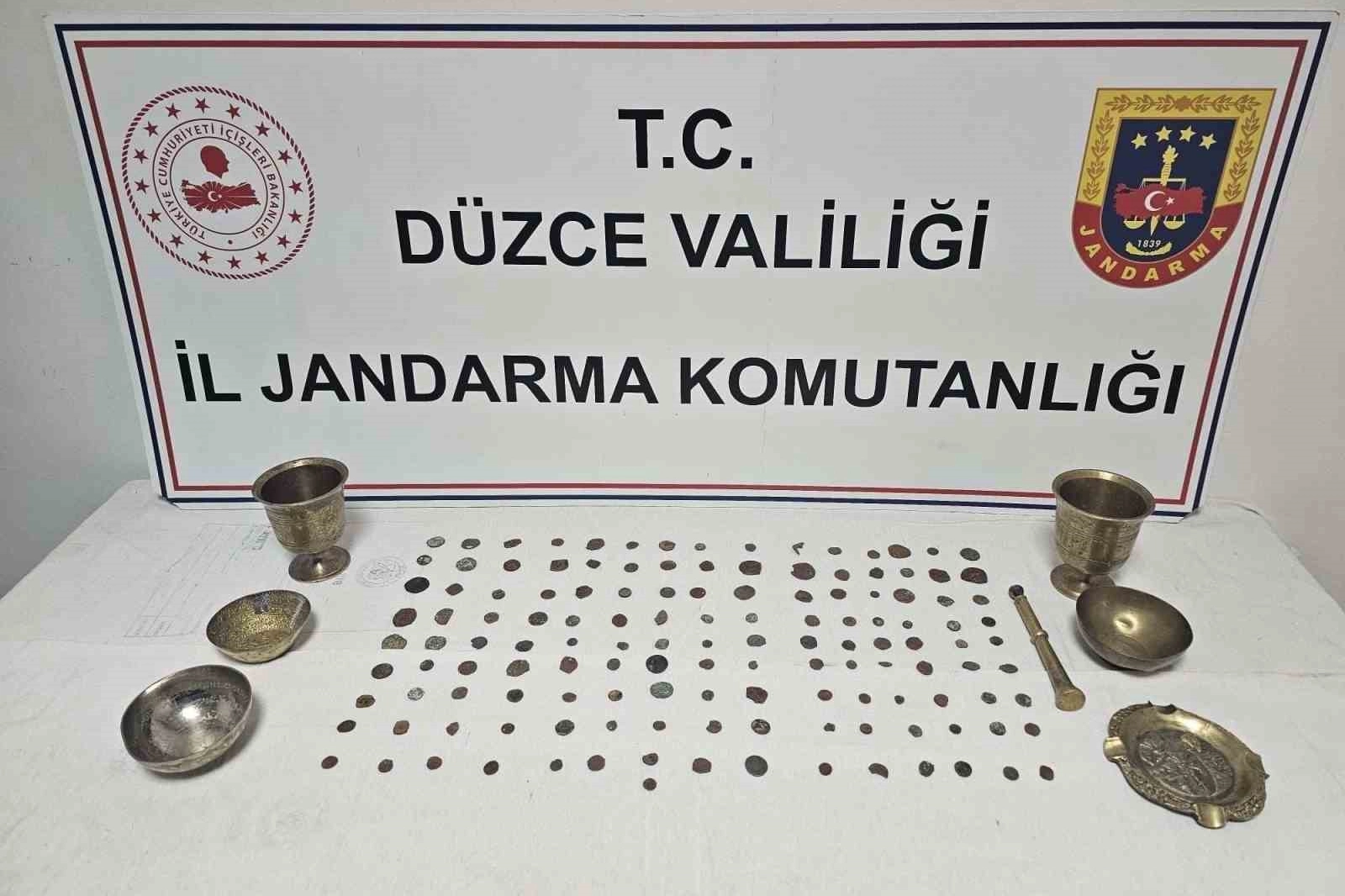Düzce’de jandarmanın düzenlediği operasyonda, Roma ve Bizans dönemlerine ait 143 parça tarihi eser 120 bin dolara satılmak istenirken yakalandı.