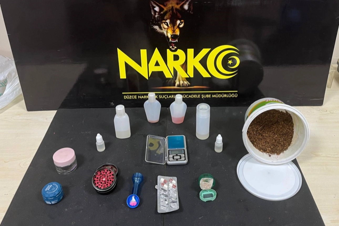 Düzce Cumhuriyet Başsavcılığı koordinesinde Narkotik Suçlarla Mücadele Şube Müdürlüğü ekiplerince Derelitütüncü Mahallesi’nde operasyon gerçekleştirildi. Yapılan operasyonda 1 parça halinde 75 gram sentetik kannabinoid maddesi, 4 gram a/m hamuru (400 gram bonzai yapılabilecek hammadde), 6 parça halinde daralı 200 gram sıvı sentetik kannabinoid maddesi, 3 gram esrar maddesi, 1 gram metamfetamin maddesi, 2 adet ectasy, 4 adet sentetik ecza ve 1 adet hassas terazi ele geçirildi. Yoğurt kovası içerisinde ele geçirilen uyuşturucu da dikkat çekti. "Uyuşturucu veya uyarıcı madde imal ve ticareti" suçundan işlem yapılarak gözaltına alınan Ö.B. (38) isimli şahıs sevk edildiği adli makamlarca tutuklandı.
