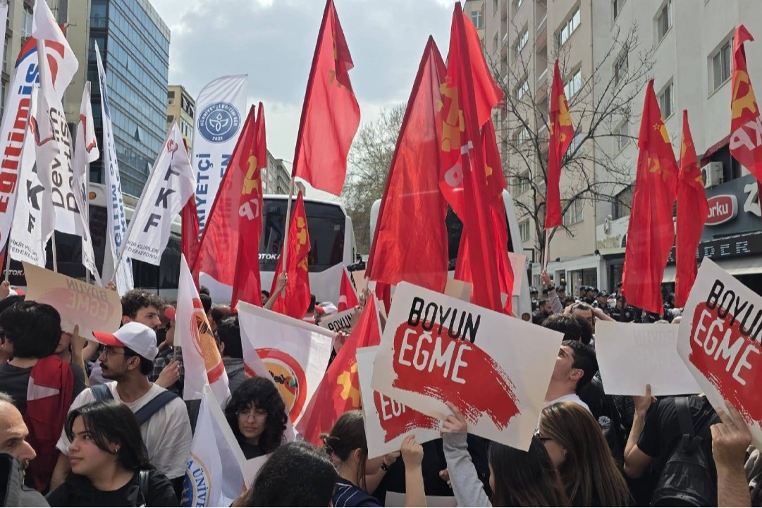 Katılımcılar, “Öğretmen düşmanı Yusuf Tekin istifa” ve “Şiddete karşı omuz omuza” sloganları eşliğinde Milli Eğitim Bakanlığı’na yürümek istedi. Ancak yürüyüş, polis tarafından kurulan barikatlarla engellendi.