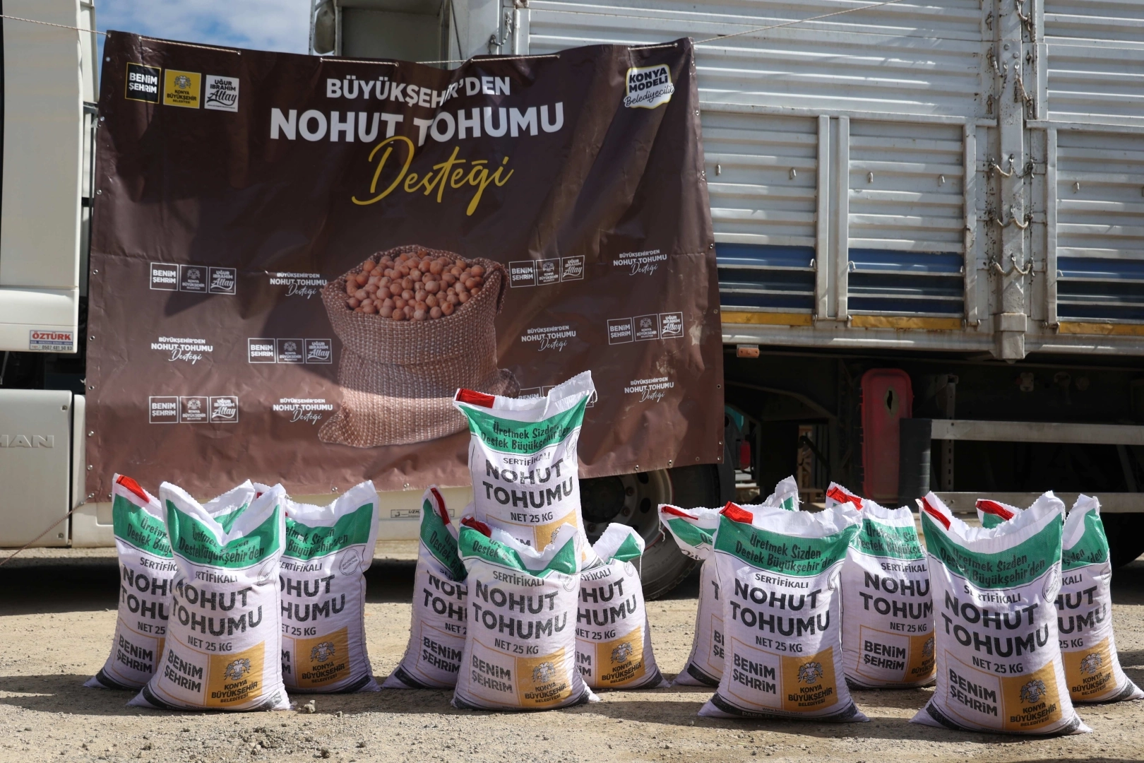 Konya Büyükşehir Belediye Başkanı Uğur İbrahim Altay, değişen iklim şartlarına karşı 31 ilçede tarımsal destekleri şekillendirdiklerini belirterek, “Kuraklıkla mücadelede ürün deseninin değişmesi büyük önem taşıyor. Nohut gibi az su isteyen ve iklim şartlarına daha dayanıklı ürünlerin yaygınlaştırılması çiftçimizin maliyetini düşürdüğü gibi su kaynaklarının korunmasına da katkı sağlıyor. Biz de 31 ilçemizde önceden başvurularını aldığımız çiftçilerimize 7 bin 725 dekar alanda ekilmek üzere yüzde 50 hibeli, 115 bin 875 kilogram nohut tohumu desteğinde bulunduk. Yapılan bu destekleme ile yaklaşık bin 100 futbol sahası büyüklüğündeki bir alanı susuz tarımla üretime kazandırmış olacağız. Bereketli olmasını diliyorum” diye konuştu.