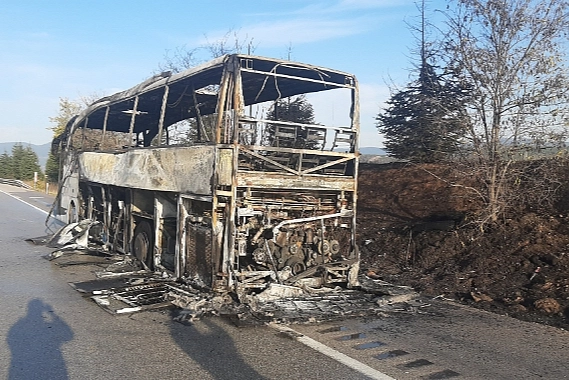 Karabük'ün Eskipazar ilçesinde seyir halindeyken motor kısmından alev alan yolcu otobüsü tamamen yanarak kullanılamaz hale geldi.
