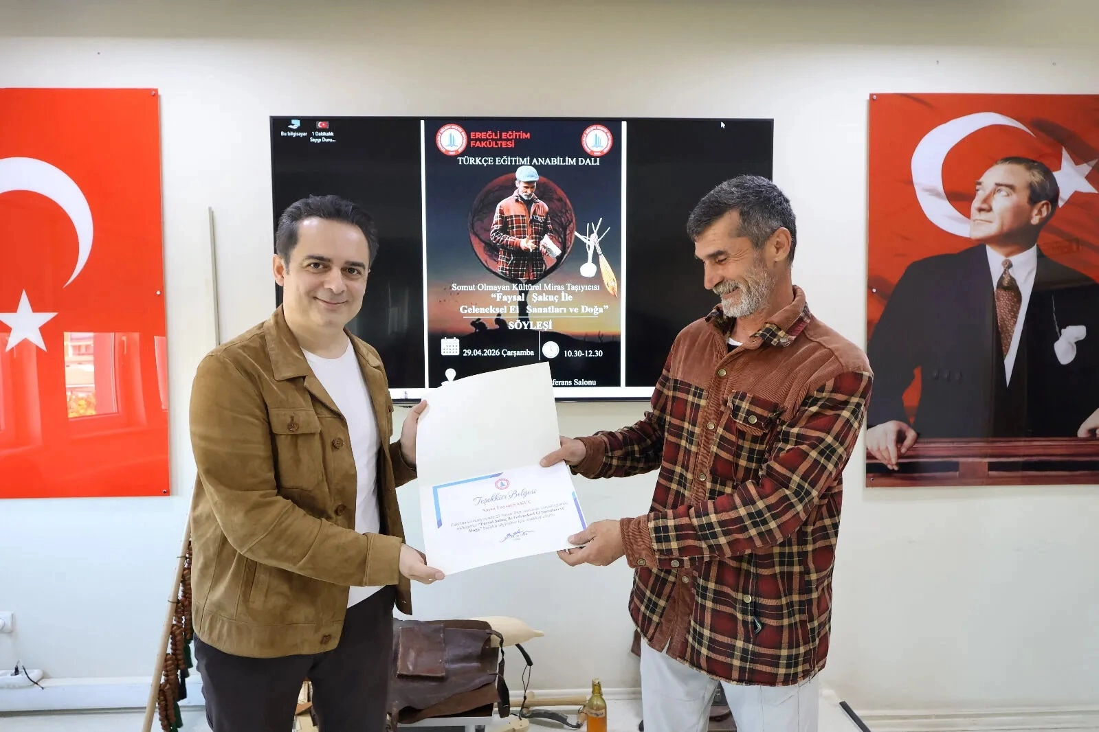 Zonguldak Bülent Ecevit Üniversitesi Ereğli Eğitim Fakültesi, anlamlı bir kültürel etkinliğe ev sahipliği yaptı. Türkçe Eğitimi Anabilim Dalı tarafından düzenlenen “Somut Olmayan Kültürel Miras Taşıyıcısı Faysal Şakuç ile Geleneksel El Sanatları ve Doğa” başlıklı söyleşi, öğrencilerin ve öğretim üyelerinin yoğun katılımıyla Prof. Dr. Ali Arslan Konferans Salonu’nda gerçekleştirildi.