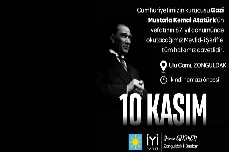 İYİ Parti Zonguldak İl Başkanlığı, Türkiye Cumhuriyeti’nin kurucusu Gazi Mustafa Kemal Atatürk’ün ebediyete irtihalinin 87. yılı dolayısıyla Mevlid-i Şerif programı düzenleyecek.