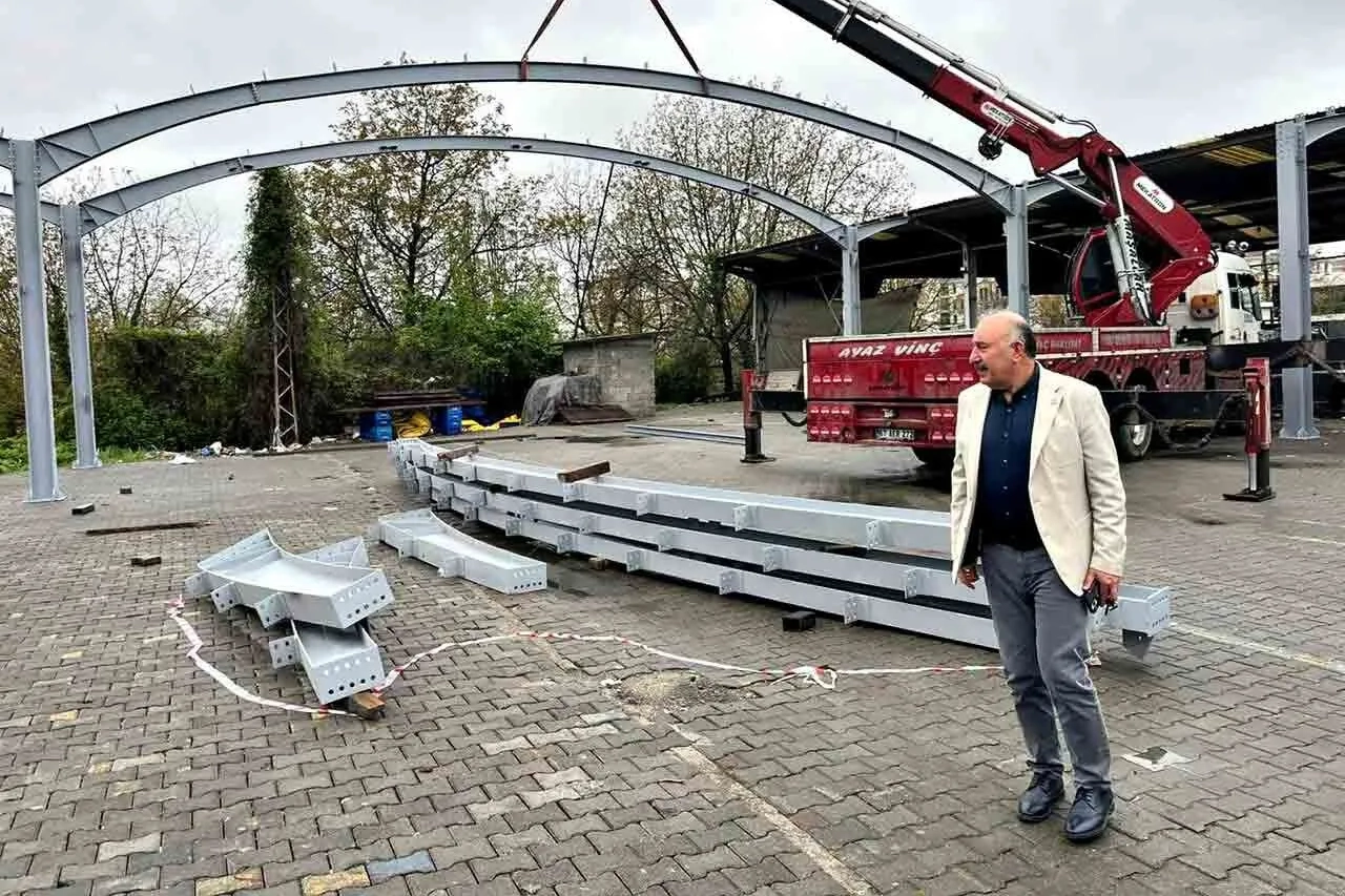 Zonguldak’ın Gökçebey ilçesinde yapımı süren kapalı pazar yerinde çelik taşıyıcı sistem montaj çalışmaları aralıksız devam ediyor.