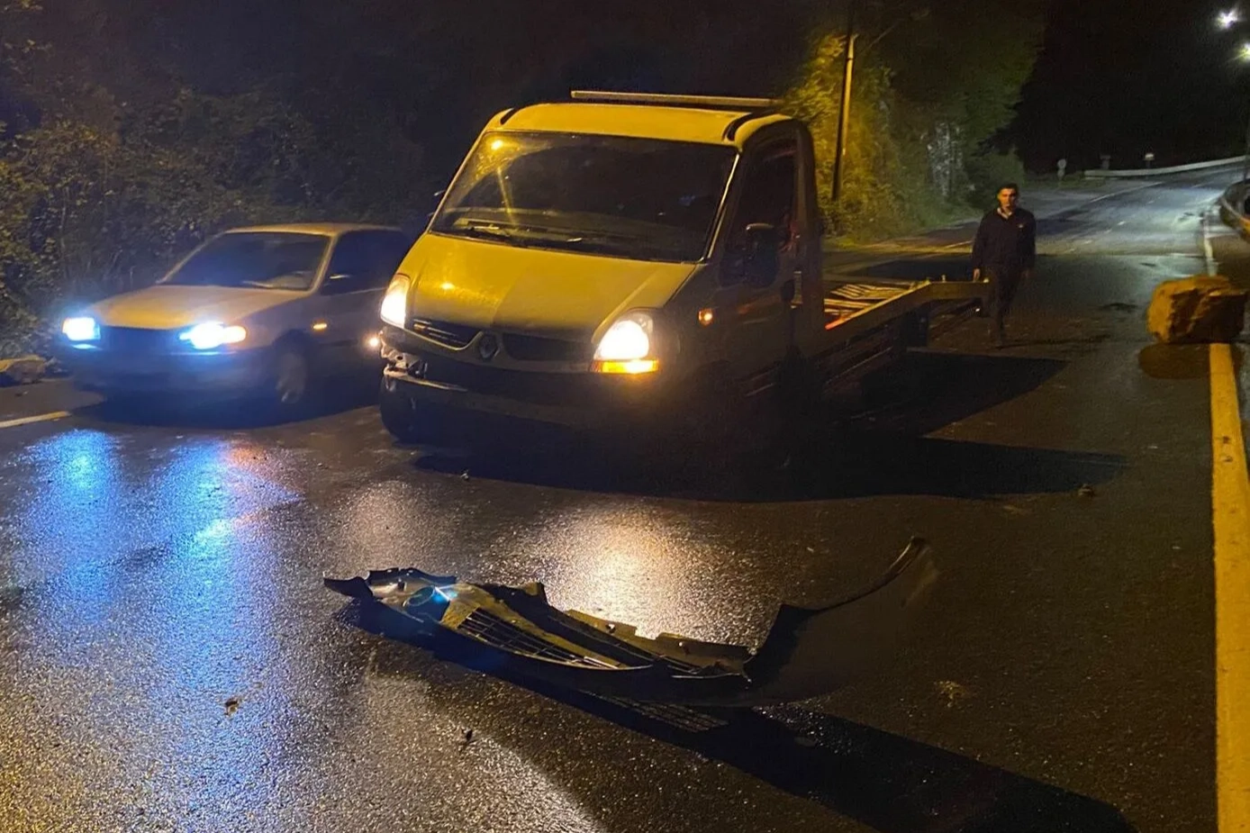 Sol şeritte ilerleyen çekici aracı kayayı son anda fark ederek kaçmaya çalışarken hem kayaya hem Pamukkale otobüsüne vurdu. Çekicinin şoförü dahil kimse yaralanmazken araçlar polis ekiplerini bekliyor