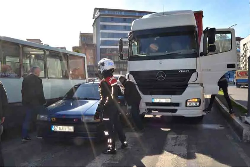 Zonguldak’ın yoğun noktalarından Ankara Caddesi’nde özel bir taksi ile kamyon çarpıştı. Kaza, Zonguldak Belediyesi arkasındaki çevre yolundan caddeye çıkan iki aracın çarpışmasıyla meydana geldi.