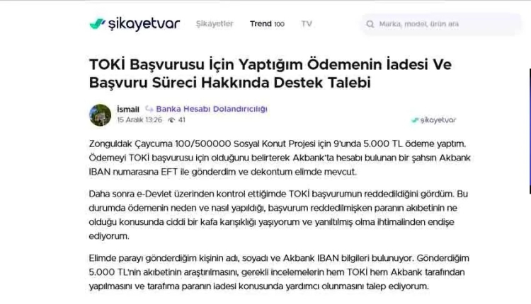 İsmail isimli vatandaş, şikayetvar adlı sitede yaptığı açıklamada şu ifadelere yer verdi: “Zonguldak Çaycuma 100/500000 Sosyal Konut Projesi için 9’unda 5.000 TL ödeme yaptım. Ödemeyi TOKİ başvurusu için olduğunu belirterek Akbank’ta hesabı bulunan bir şahsın Akbank IBAN numarasına EFT ile gönderdim ve dekontum elimde mevcut.
