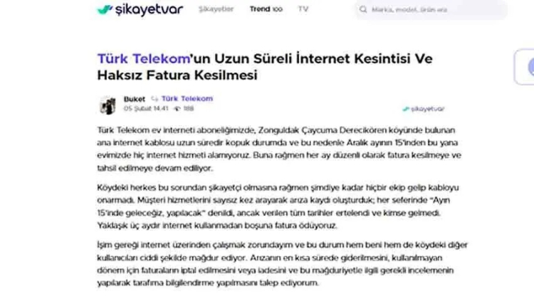İnternet hizmeti verilmemesine rağmen her ay düzenli olarak fatura kesildiğini ve tahsil edildiğini belirten Buket isimli kadın; “Türk Telekom ev interneti aboneliğimizde, Zonguldak Çaycuma Derecikören köyünde bulunan ana internet kablosu uzun süredir kopuk durumda ve bu nedenle Aralık ayının 15’inden bu yana evimizde hiç internet hizmeti alamıyoruz. Buna rağmen her ay düzenli olarak fatura kesilmeye ve tahsil edilmeye devam ediliyor.