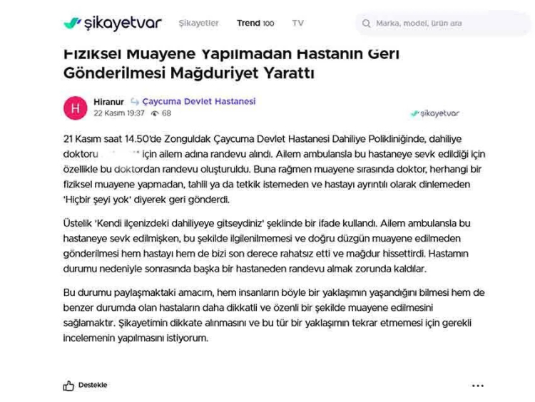 Zonguldak Çaycuma Devlet Hastanesi'nde bir vatandaş, sevkli olarak getirilen aile ferdinin yeterli muayene yapılmadan geri gönderildiğini belirtti. Şikayetçi, doktorun ilgisiz olduğunu ve sağlık sorunlarının ihmal edildiğini iddia etti. İnceleme talep ediliyor.