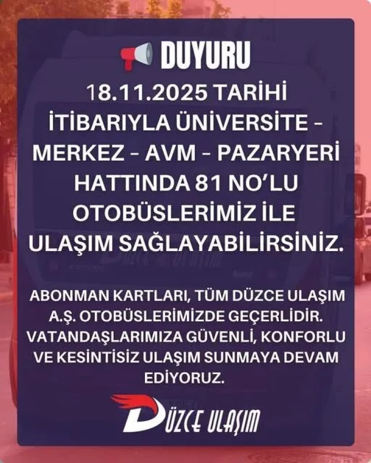“18.11.2025 tarihi itibarıyla Üniversite – Merkez – AVM – Pazaryeri hattında 81 nolu otobüslerimiz ile ulaşım sağlayabilirsiniz. Abonman kartları, tüm Düzce Ulaşım A.Ş. otobüslerimizde geçerlidir. Vatandaşlarımıza güvenli, konforlu ve kesintisiz ulaşım sunmaya devam ediyoruz.”