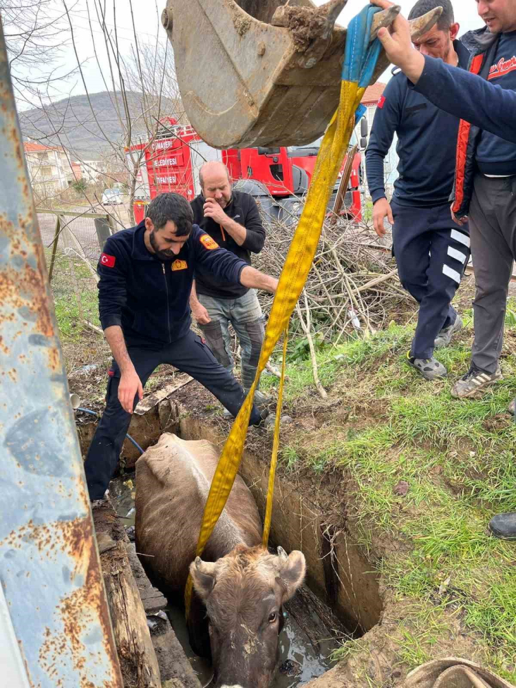 Düzce’de kuyuya düşen inek Cumayeri Belediyesi ekiplerince yapılan çalışmanın ardından bulunduğu yerden kurtarıldı.