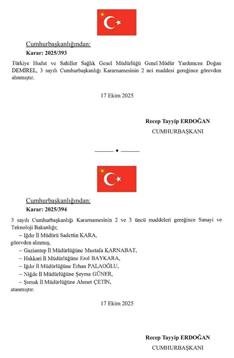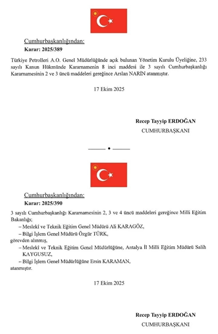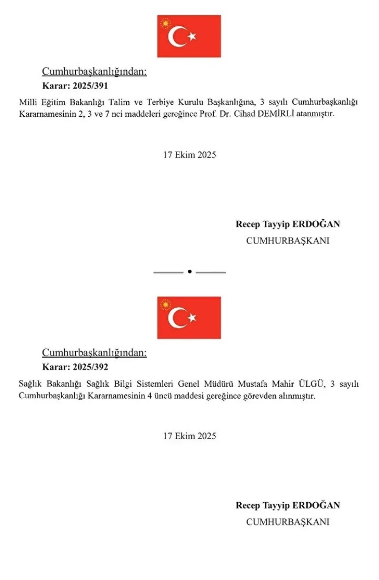 Cumhurbaşkanı Erdoğan’ın imzasıyla yayımlanan atama ve görevden alma kararları Resmi Gazete’de duyuruldu