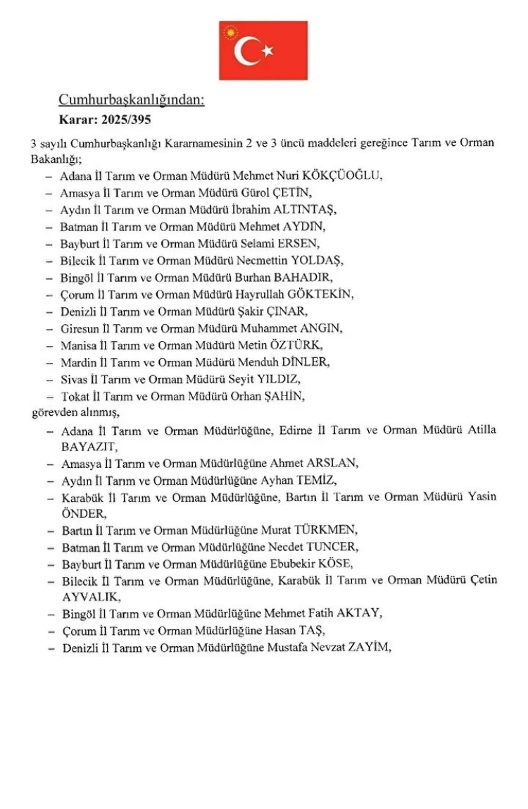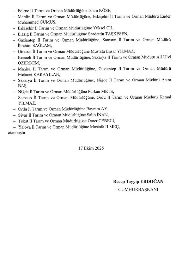 Tarım ve Orman Bakanlığı’nda ise 14 ilin İl Müdürü görevden alınırken, toplam 26 ilin İl Müdürlüğünde değişikliğe gidildi. Görevden alınan ve atanan isimler Resmi Gazete’de detaylı olarak yayımlandı.