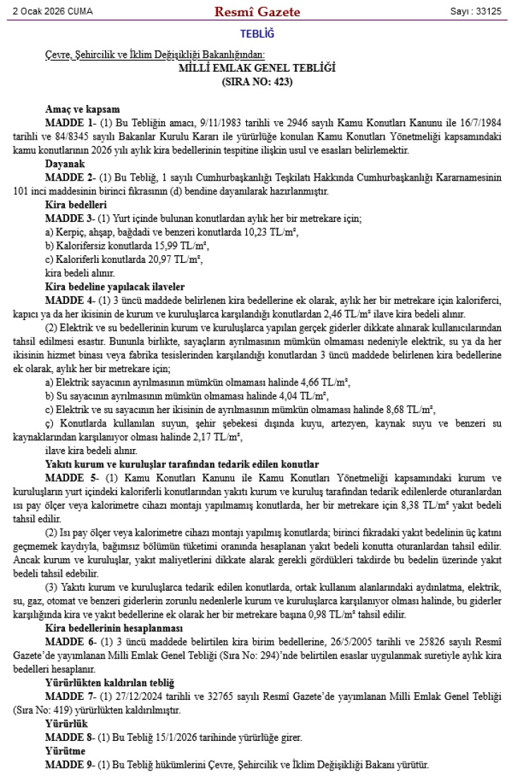Çevre, Şehircilik ve İklim Değişikliği Bakanlığı, 2026 yılı kamu konutu kira bedellerini düzenleyen Milli Emlak Genel Tebliği'ni bugünkü Resmi Gazete'de yayımladı.