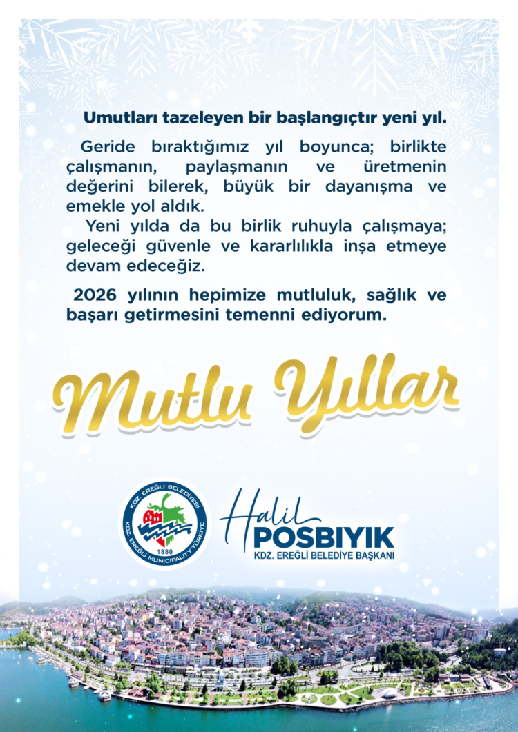 Kdz. Ereğli Belediye Başkanı Halil Posbıyık, yeni yılı umut veren bir başlangıç olarak nitelendirdiği mesajında, dayanışma ve emeğin önemine vurgu yaparak, birlikte çalışma ruhunun devam edeceğini belirtti. 2026’nın sağlık ve başarı getirmesini diledi.