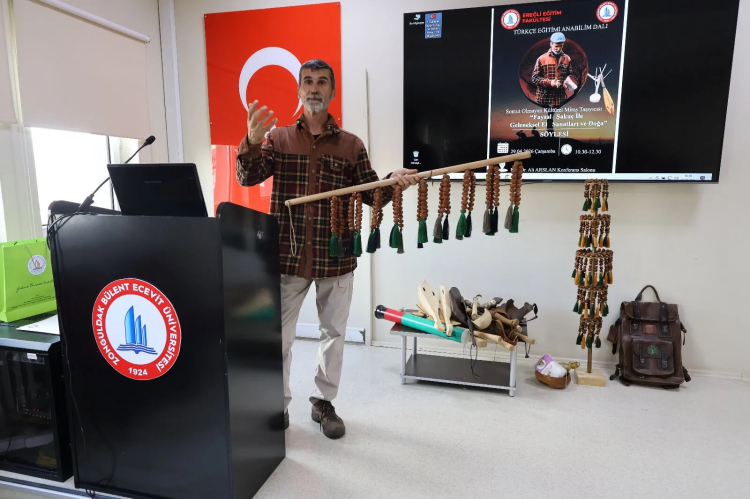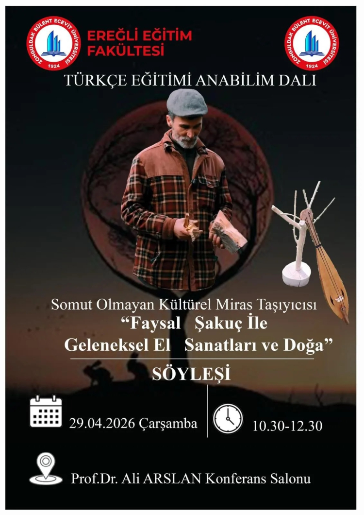 ZBEÜ Ereğli Eğitim Fakültesi'nde 29 Nisan 2026'da Faysal Şakuç ile 'Geleneksel El Sanatları ve Doğa' söyleşisi düzenlendi. Etkinlikte kültürel mirasın önemi vurgulanırken Şikepşine ve Tamate Beşi tanıtıldı.