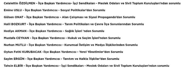 Celalettin Özdilmen – İşçi sendikaları, meslek odaları ve STK’lardan sorumluEmine Uslu – Sosyal politikalardan sorumluGülşen Onat – Alan çalışması ve siyasi propagandadan sorumluHalil Bozkurt – Tarım politikaları ve çevre ilçe sorunlarından sorumluHediye Akman – Sağlık işleri’nden sorumluMustafa Ceyhan – Hukuk ve seçim işlerinden sorumluNurhan Mutlu – Kurumsal iletişim ve medya ilişkilerinden sorumluOytun Fethi Kurubacak – Yerel yönetimlerden sorumluSayim Ergün – Tanıtım ve halkla ilişkiler’den sorumluTahsin Elbir – İşçi sendikaları, meslek odaları ve STK’lardan sorumlu