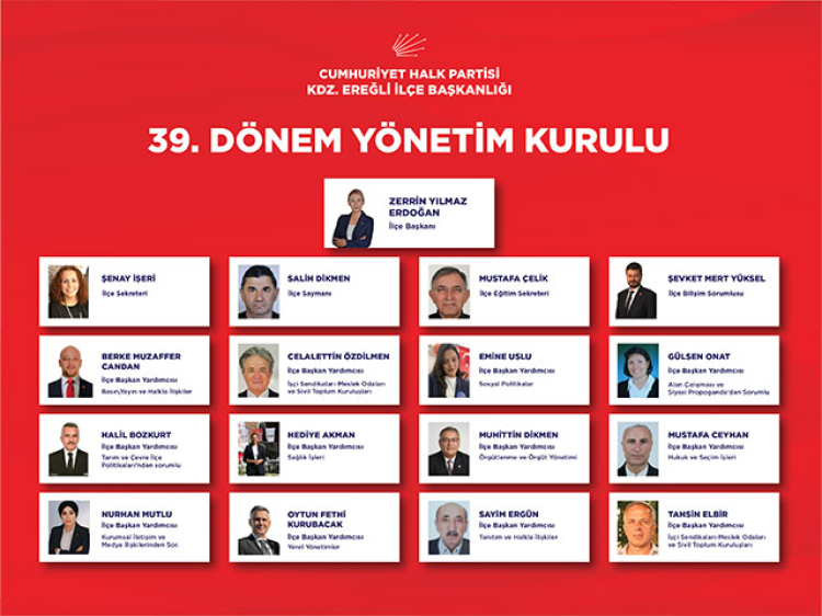 Cumhuriyet Halk Partisi(CHP) Kdz. Ereğli İlçe Örgütü, 39. Dönem Yönetim Kurulu görev dağılımını kamuoyuyla paylaştı. İlçe başkanı Zerrin Yılmaz Erdoğan başkanlığında 2 Ekim 2025 tarihinde gerçekleştirilen birinci olağan yönetim kurulu toplantısında, yönetim kurulu üyelerinin görevleri belirlendi.