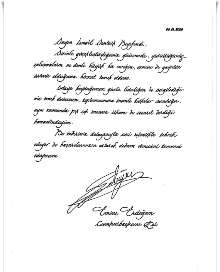 Erdoğan, 6 Ocak 2026 tarihli mektubunda, gerçekleştirilen görüşme kapsamında Dernek Başkanı İsmail Şentürk’ün yürüttüğü çalışmaların büyük bir emek, azim ve gayretin ürünü olduğuna bizzat tanık olduğunu ifade etti. Emine Erdoğan, ortaya konulan güçlü liderliğin ve sergilenen örnek duruşun topluma önemli katkılar sunduğunu, aynı zamanda pek çok insana ilham ve cesaret verdiğini vurguladı.