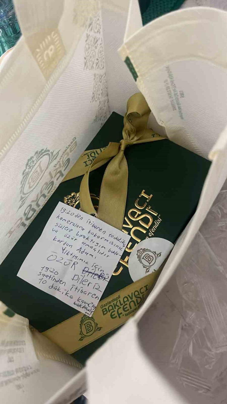 Sabah işyerin geldiğinde kapısının önünde bir kutu baklava bulan işyeri sahibi, gençlerin "Abla güvenlik kamerası görüntülerini izler misin? Özür dileriz" notuyla karşılaştı.