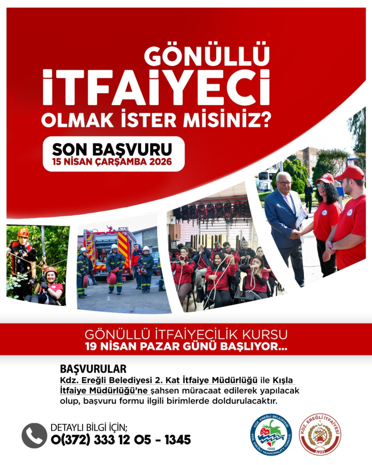 Kdz. Ereğli Belediyesi İtfaiyesi'nin 17. Gönüllü İtfaiyeci Kursu kayıtları başladı. 15 Nisan'da sona erecek başvurularla, afet bilincini artırmak amaçlanıyor. Eğitimler 19 Nisan'da başlayacak. Başarılılara sertifika ve kimlik kartı verilecek. 2026'ya kadar 568 gönüllü yetişti.