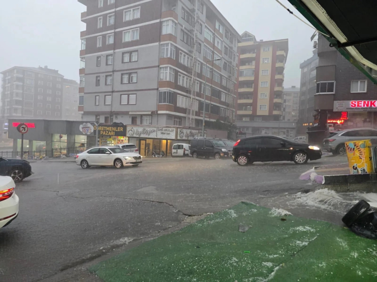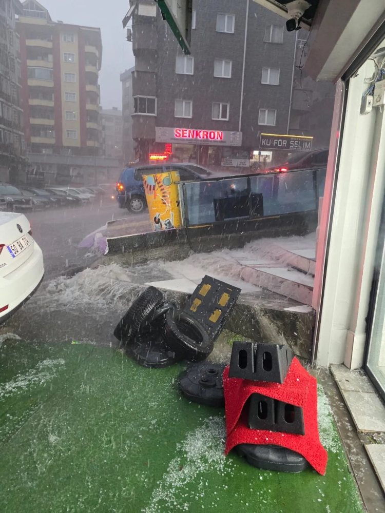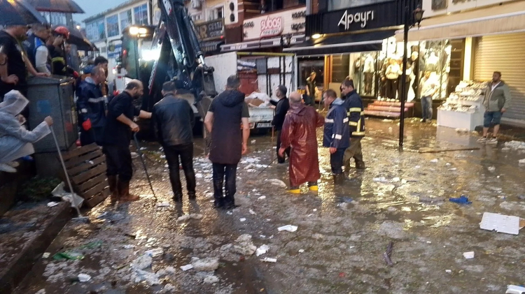 Çarşı merkezini su bastı, tıkanan giderler nedeniyle yolun bir bölümü ile işyerleri sular altında kaldı. Belediye ekipleri ve çevredeki esnaf çalışmalarını sürdürüyor.