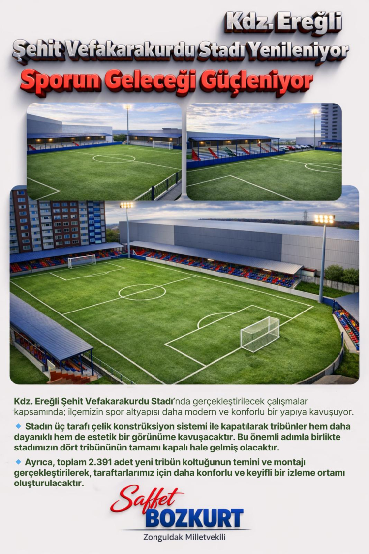 AK Parti Zonguldak Milletvekili Saffet Bozkurt, Kdz. Ereğli Şehit Vefa Karakurdu Stadı’nda yapılacak yatırımları açıkladı. Stadın 3 tarafı çelik konstrüksiyonla kapatılacak, 2 bin 391 yeni koltuk takılacak. Bozkurt, spor altyapısının modernleşeceğini belirtti.