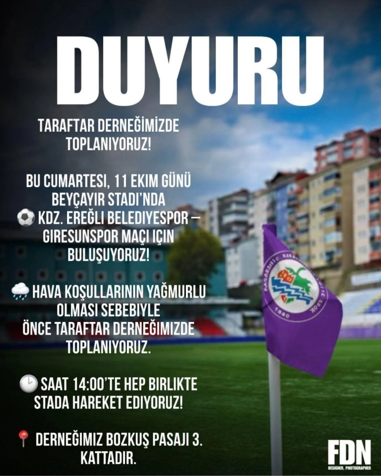 Kdz. Ereğli Belediyespor taraftarları, 11 Ekim Cumartesi Giresunspor maçı öncesi kötü hava koşulları nedeniyle toplanma yerini değiştirdi. Genç Ereğliler, saat 14.00'te Bozkuş Pasajı'nda buluşup birlikte stada hareket edeceklerini duyurdu.