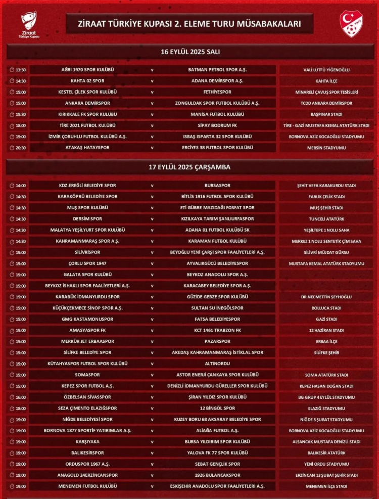 TFF, bugün Ziraat Türkiye Kupası 2. Eleme Turu maçlarının günü ve saatini açıkladı.