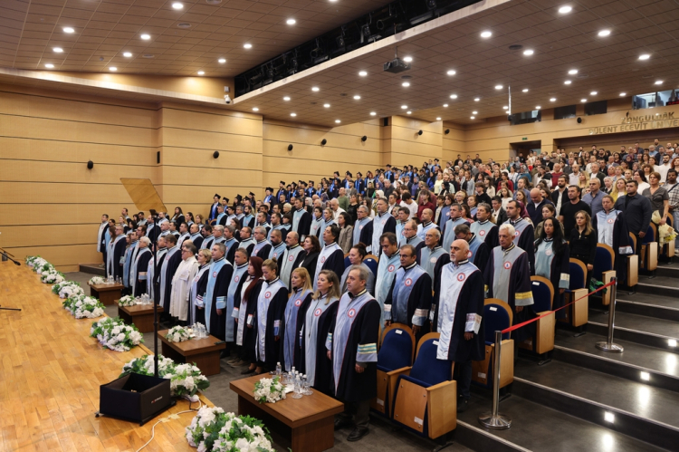 Saygı duruşu ve İstiklal Marşı’nın okunması ile başlayan törenin hemen ardından Devlet Konservatuvarı öğrencileri tarafından müzik dinletisi gerçekleştirildi. Dinletinin akabinde Fen Bilimler Enstitüsü İnşaat Mühendisliği Ana Bilim Dalı doktora mezunu Arş. Gör. Dilek Cansu Bozacıoğlu, tüm mezunlar adına bir konuşma yaptı.