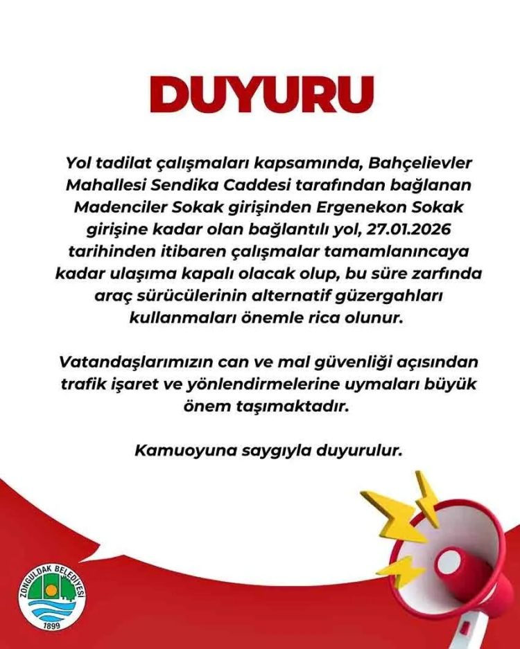 Sendika Caddesi tarafından bağlanan Madenciler Sokak girişinden Ergenekon Sokak girişine kadar olan bağlantı yolu, 27 Ocak 2026 tarihinden itibaren çalışmalar tamamlanıncaya kadar ulaşıma kapalı olacak.