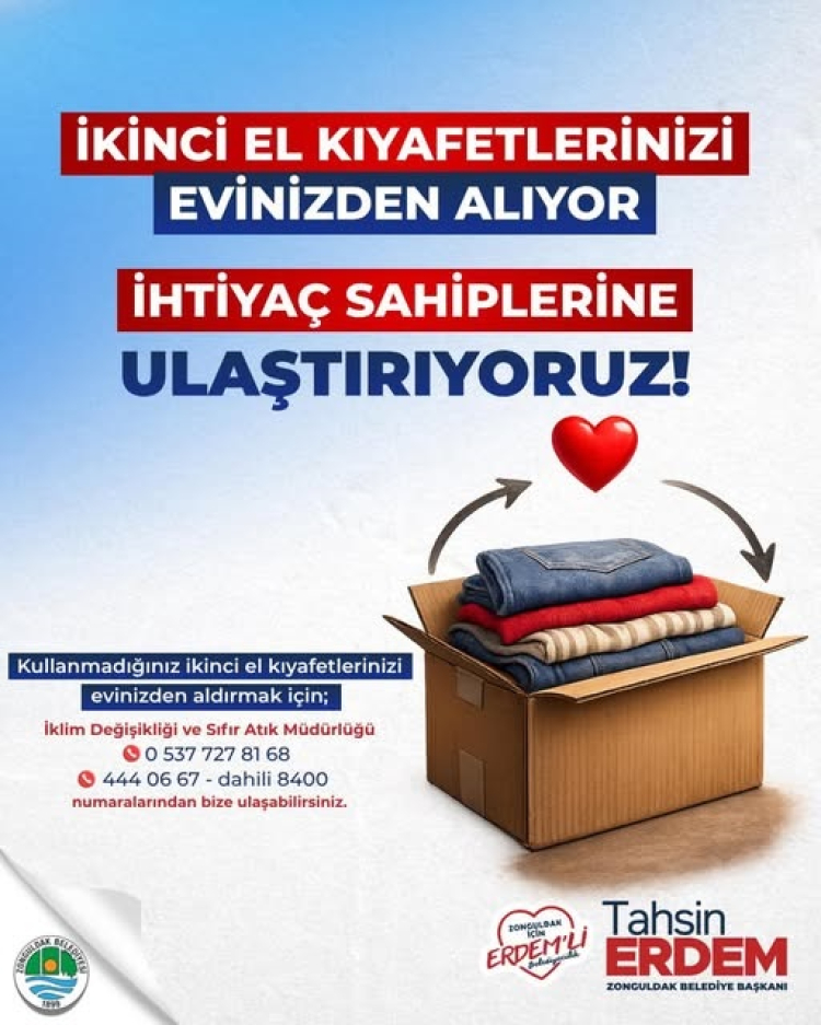 Zonguldak Belediyesi, kullanılmayan ikinci el kıyafetlerin ihtiyaç sahiplerine ulaştırılması için dayanışma çalışması başlattı. Bağışlar İklim Değişikliği ve Sıfır Atık Müdürlüğü aracılığıyla adreslerden alınacak.