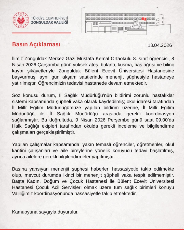 Zonguldak'ta 8 Nisan'da bir öğrencide menenjit şüphesi üzerine hastaneye yatış gerçekleşti. Vali Osman Hacıbektaşoğlu, ikinci bir vaka olmadığını, sağlık ekiplerinin koordineli çalıştığını açıkladı. Okulda inceleme ve koruyucu tedavi başlatıldı. (13 Nisan 2026)