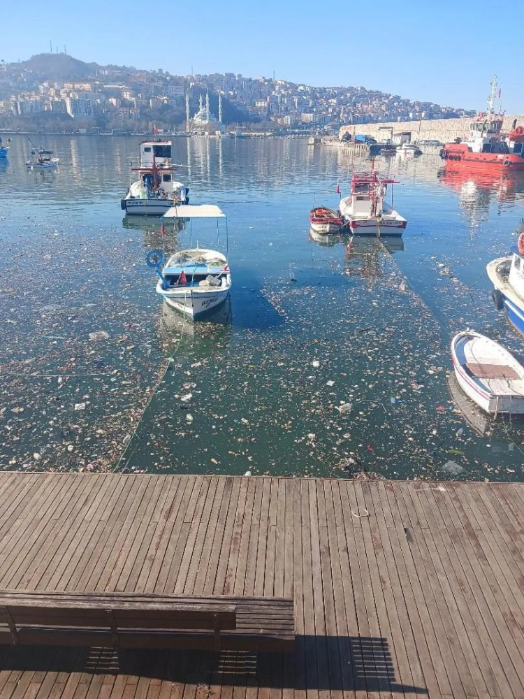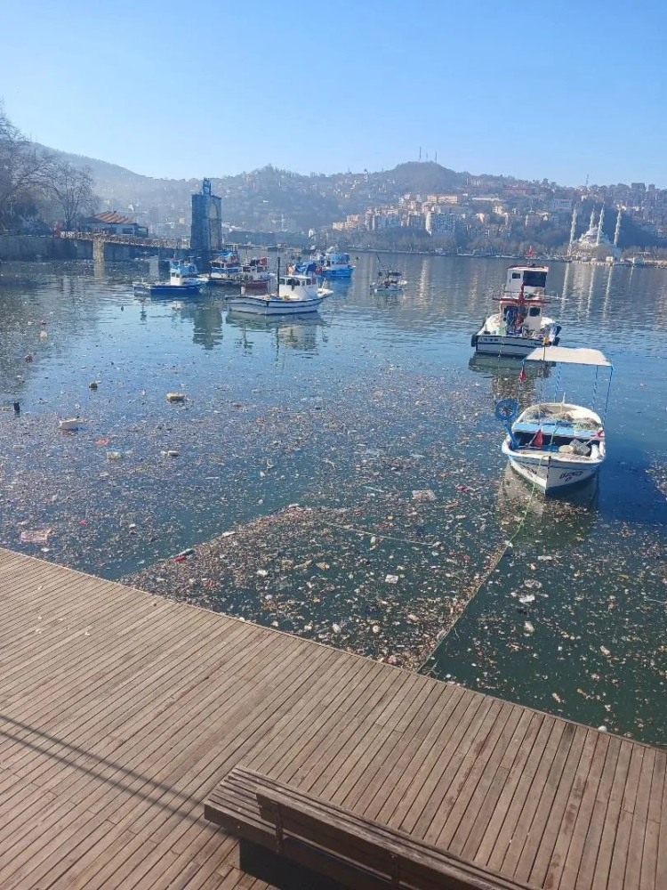 Zonguldak’ta sağanak yağış sonrasında derelerden sürüklenen tahta ve plastik atıklar limanın üzerini kapladı.