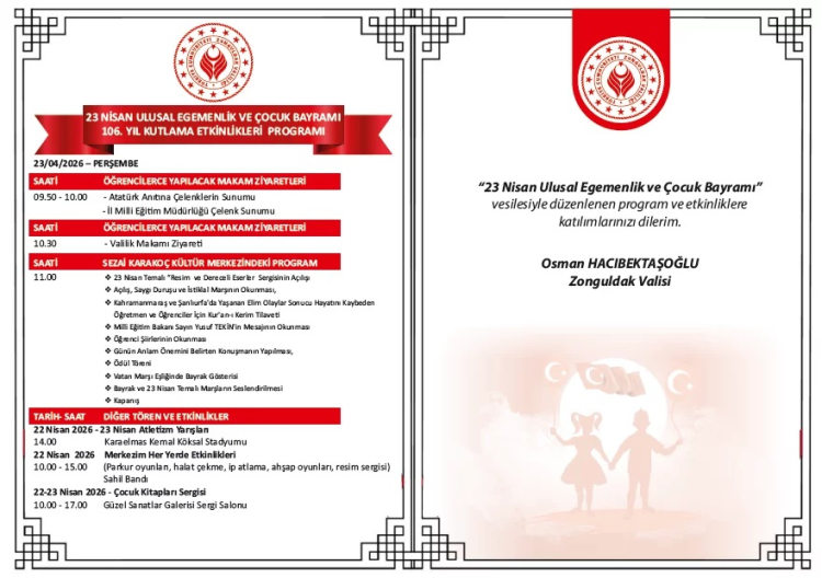 Zonguldak'ta 23 Nisan Ulusal Egemenlik ve Çocuk Bayramı'nın 106. yılı, Vali Osman Hacıbektaşoğlu'nun duyurduğu programla kutlanacak. 22-23 Nisan'da gerçekleşecek etkinliklerde törenler, sergiler, yarışmalar ve öğrenci gösterileri yer alacak.