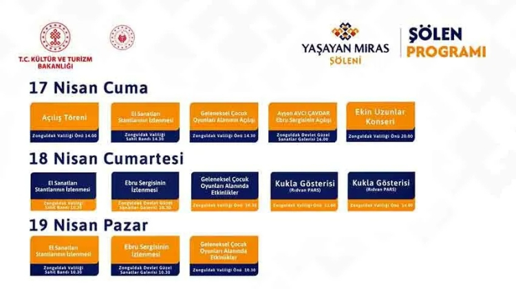 Zonguldak'ta Turizm Haftası kutlamaları kapsamında "Yaşayan Miras Şöleni" 17-19 Nisan'da düzenlenecek. El sanatları, geleneksel oyunlar, ebru sergisi ve Ekin Uzunlar konseri etkinlikler arasında yer alıyor.