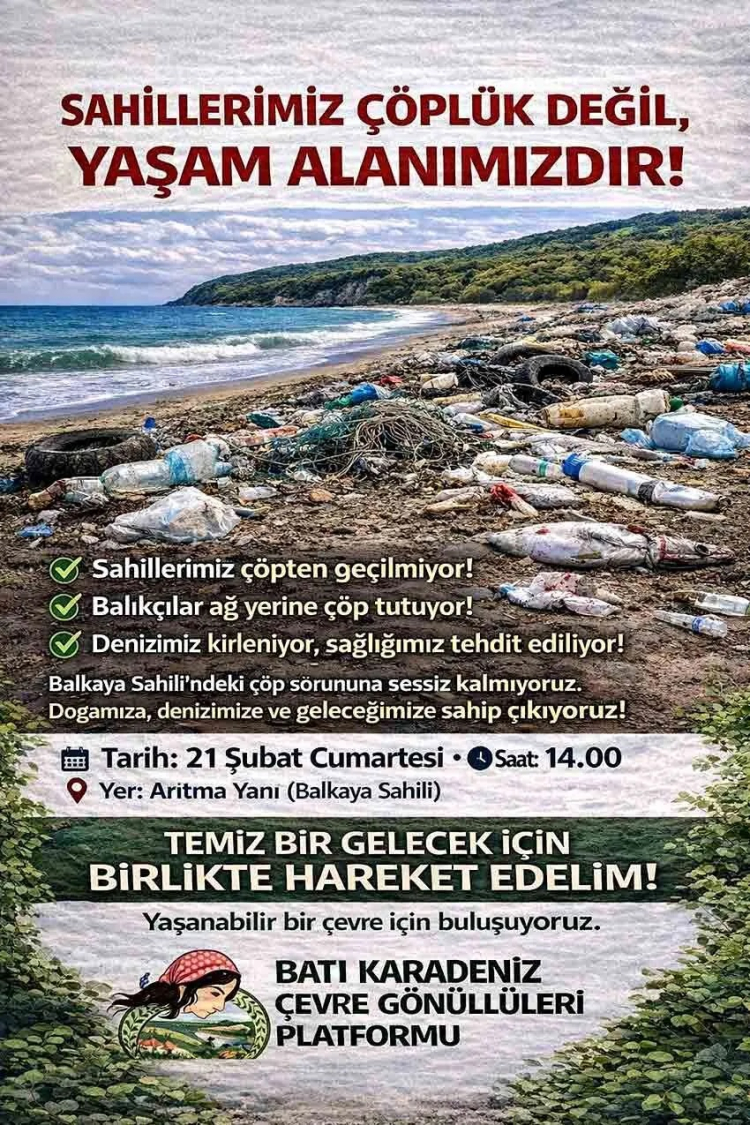 Batı Karadeniz Çevre Gönüllüleri Platformu, Zonguldak Balkaya Sahili'ndeki çöp sorununa dikkat çekti. 21 Şubat Cumartesi 14:00'te sahil temizliği yapılacak. Platform, sahillerin çöplük değil, yaşam alanı olduğunu vurguluyor. Deniz kirliliği sağlığı tehdit ediyor.